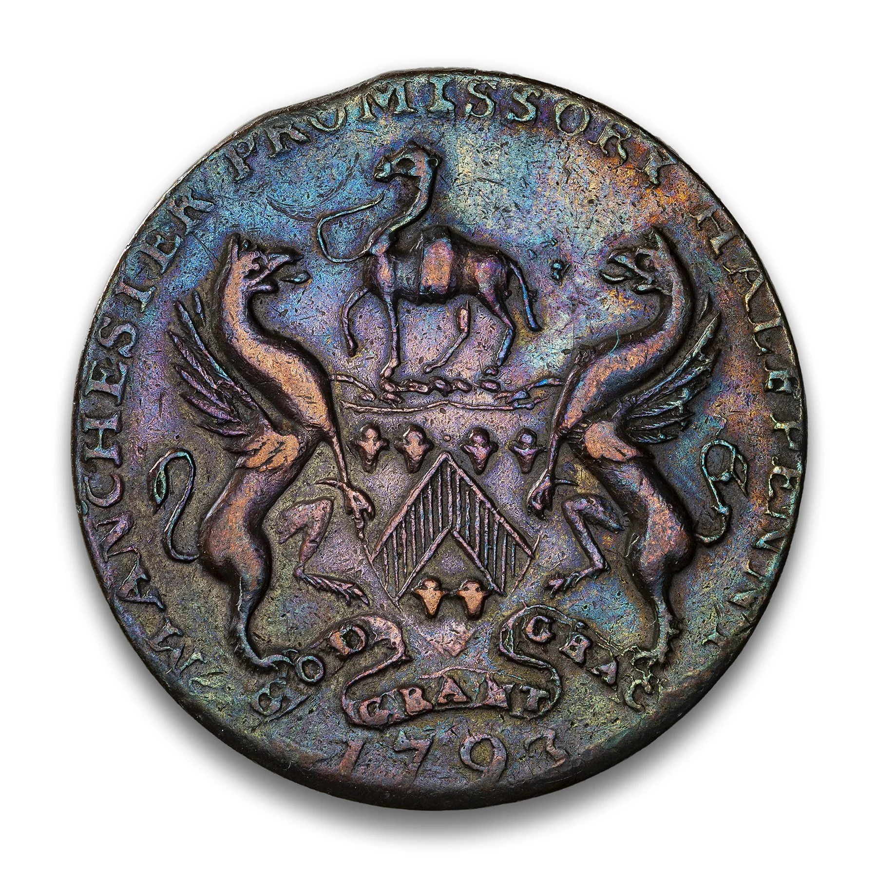 The token artists, Arnold and Roger Dixon, did a commendable job replicating it. We see a shield flanked by griffins on each side, crowned by a camel carrying what looks like a saddle but is actually bags of spices on its back. Below this ensemble is a banner bearing the inscription "GOD GRANT GRACE," complemented by the legend: "MANCHESTER PROMISSORY HALFPENNY 1793."
